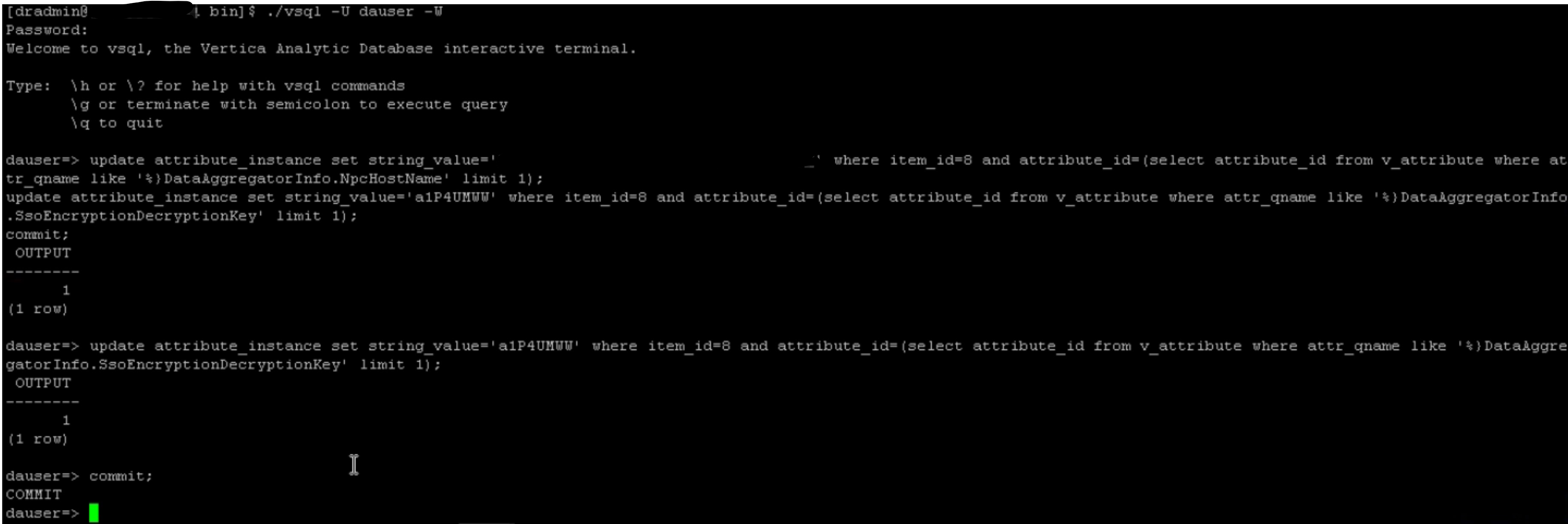 We will update the Vertica database with the SsoEncryptionDecryptionsKey value from the MySQL database and the Portal hostname (manually).