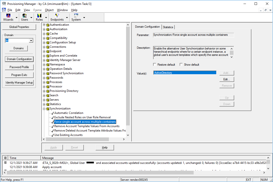 Synchronization/Force single account across multiple containers set to ActiveDirectory