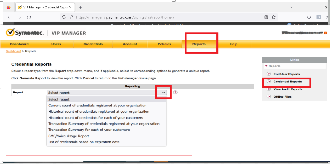 Log in to the VIP manager >> Go to Reports Tab >> Click on Credential Reports >> Click on the drop down Arrow and select the reports that you would like to fetch as shown in the below screenshot.