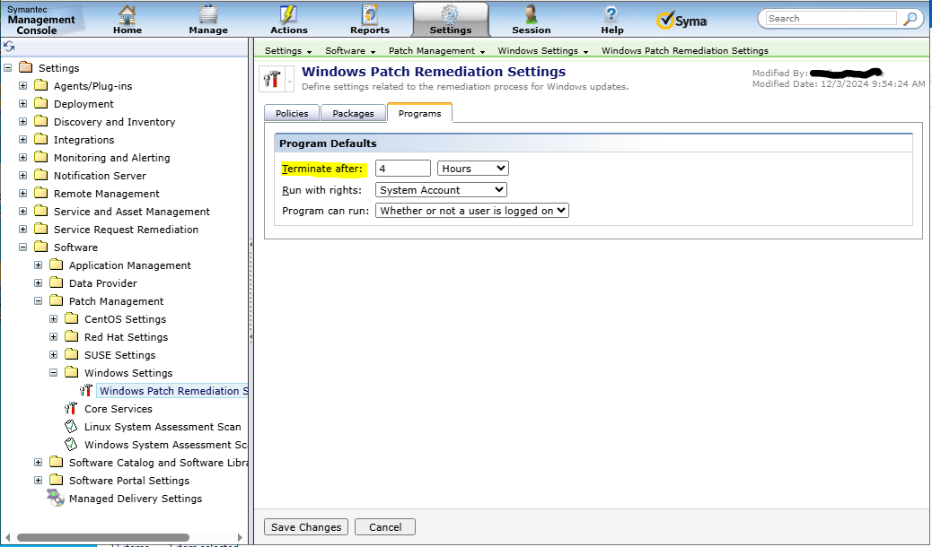 Navigate in the Symantec Management Platform console to Settings > All Settings > Software > Patch Management > Windows Settings > Windows Patch Remediation Settings