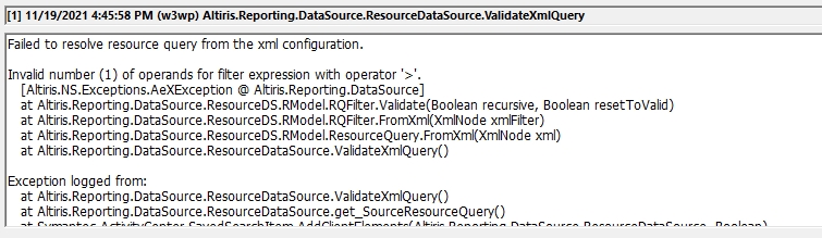 Failed to resolve resource query from the xml configuration.Invalid number (1) of operands for filter expression with operator '>'.