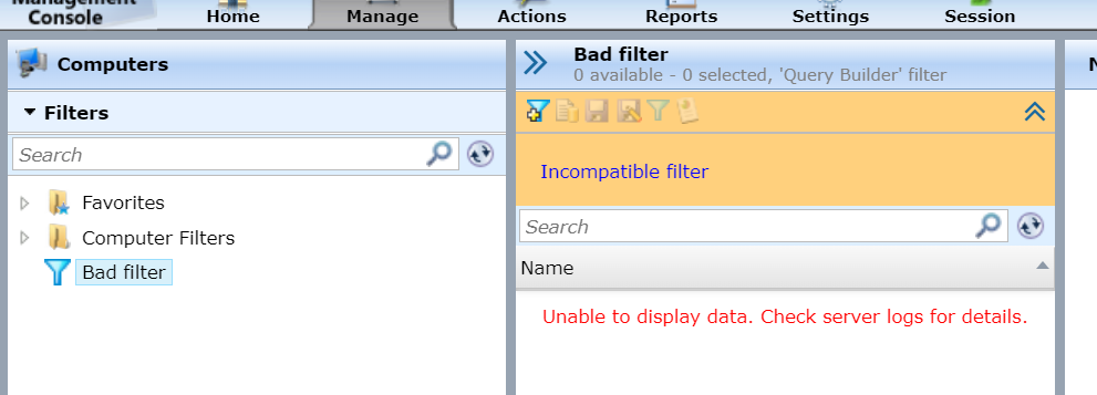 Column '[].[]' is not found [System.ApplicationException @ Symantec.ActivityCenter.Api] at Symantec.ActivityCenter.Api.Models.Filter.SavedSearchToFilter.FindColumn(String dataTableName, String columnName, SavedSearch savedSearch) at Symantec.ActivityCenter.Api.Models.Filter.SavedSearchToFilter.GetFilterCriteria() at Symantec.ActivityCenter.Api.Models.Filter.SavedSearchToFilter.Convert() at Symantec.ActivityCenter.Api.Models.Filter.FilterProvider.GetFilter(Guid id) at Symantec.ActivityCenter.Api.Controllers.MainController.GetFilter(Guid id) at lambda_method(Closure , Object , Object[] )