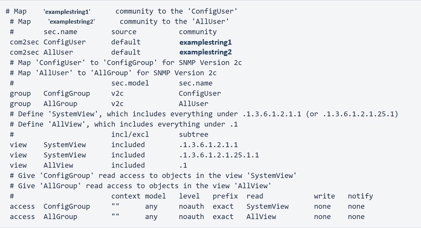 In the first scenario: ConfigUser is assigned to the ConfigGroup and may only use SNMP security model 2c, ConfigGroup can use the SystemView, SystemView is assigned to two OID sub-trees, and all of this is referenced in the SNMP poll by the secret and unique community string: 'idv90we3rnov90wer'.