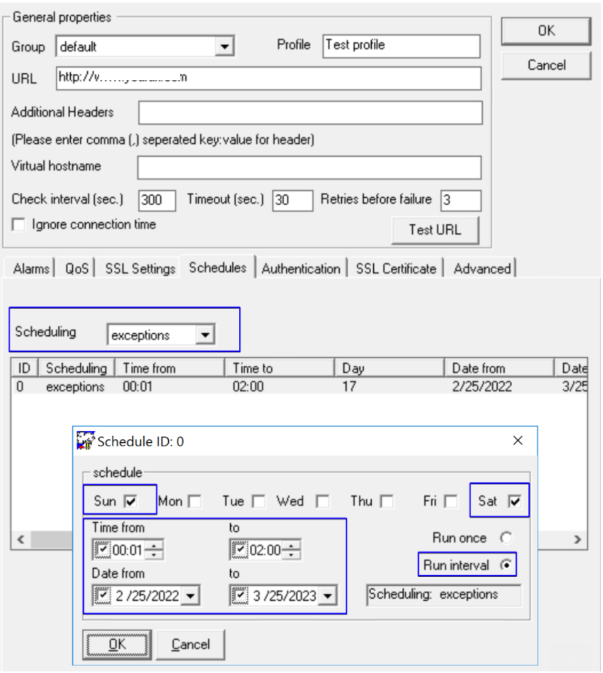 Use this option, if you do NOT want to use the Check interval time and want to refine the time interval of running the profile. For example, run your profile to monitor the URL only on Wednesday mornings at 8:00 A.M. The following options are available for the scheduling.