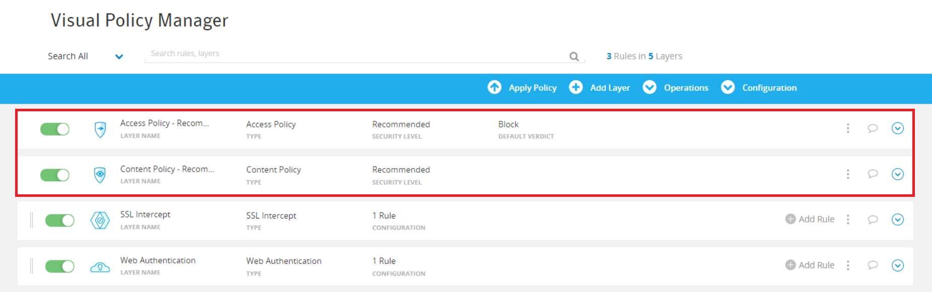 Two pre-configured policies, Access Security Policy and Content Security Policy, are available in 7.x release. These policies are configured through the web Visual Policy Manager (VPM) and require minimal manual input and deployment time. Use this feature to implement best-practices security coverage out of the box, and to facilitate setup, deployment, and testing of policies.