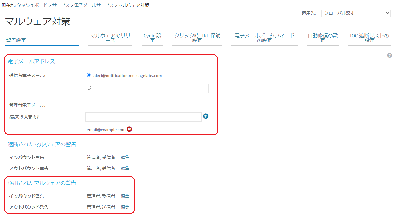 配送後にメールにマルウェアが含まれていたと判明した場合の通知設定について説明します。
