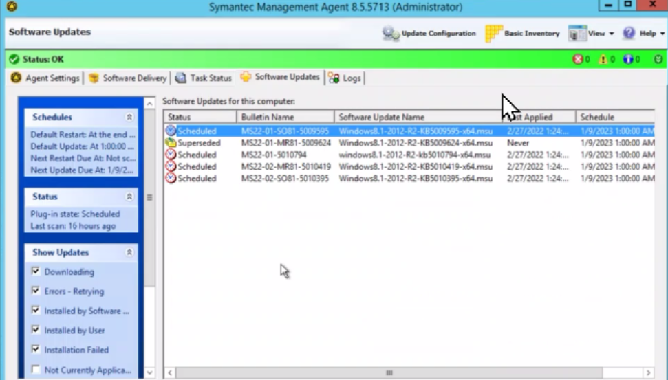 The Symantec Management Agent shows Bulletins as Scheduled after they were staged and the computer is rebooted: