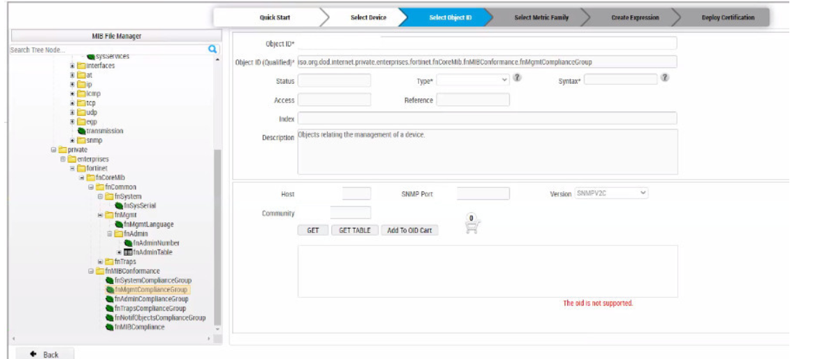 In this use case fortinet core MIB file and fortigate mib file were uploaded together in the self cert portlet which resolved the issue