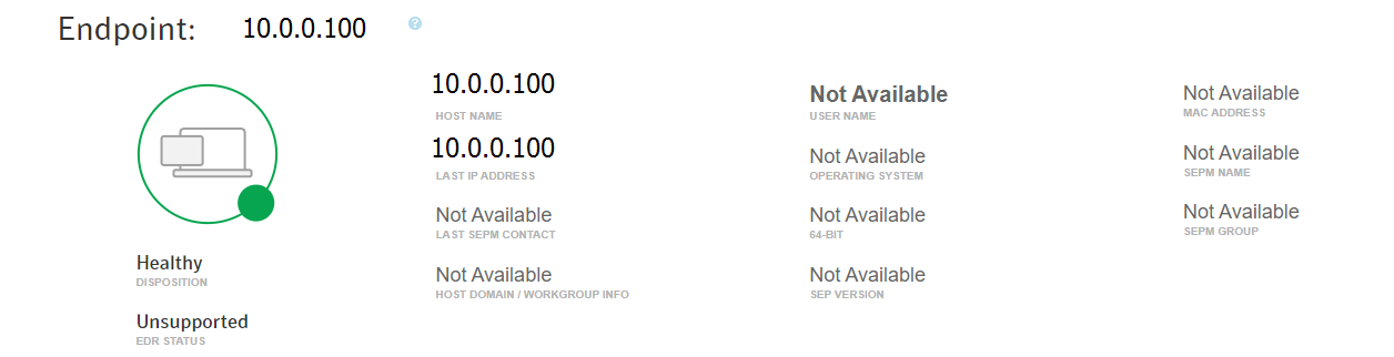イベントが発生すると、EDR は内部データベースをチェックして、イベントを既知のエンドポイントに関連付けることができるかどうかを確認します。 内部データベースに既知のエンドポイントがリストされていない場合、EDR は利用可能な情報を含むエントリを作成し、その他のすべての値を "Not Available" か "Unsupported" に設定します。