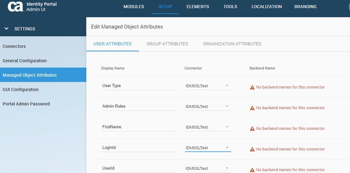 Opening the Portal Admin > Setup > Managed Object Attributes will show all the attributes with a "No backend names for this connector" message: