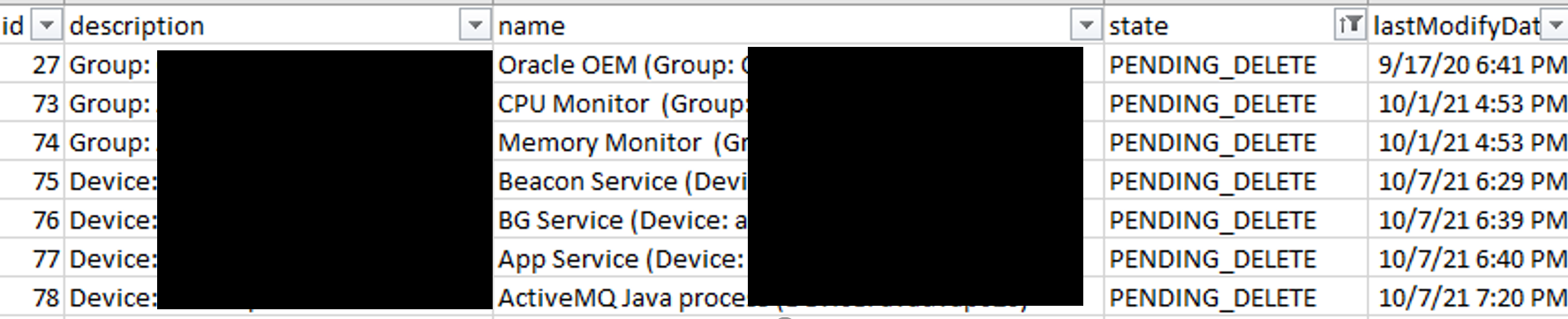 3. Run the query below against each policy ID with the PENDING_DELETE state and delete the Policy from the OC Alarm Policies page