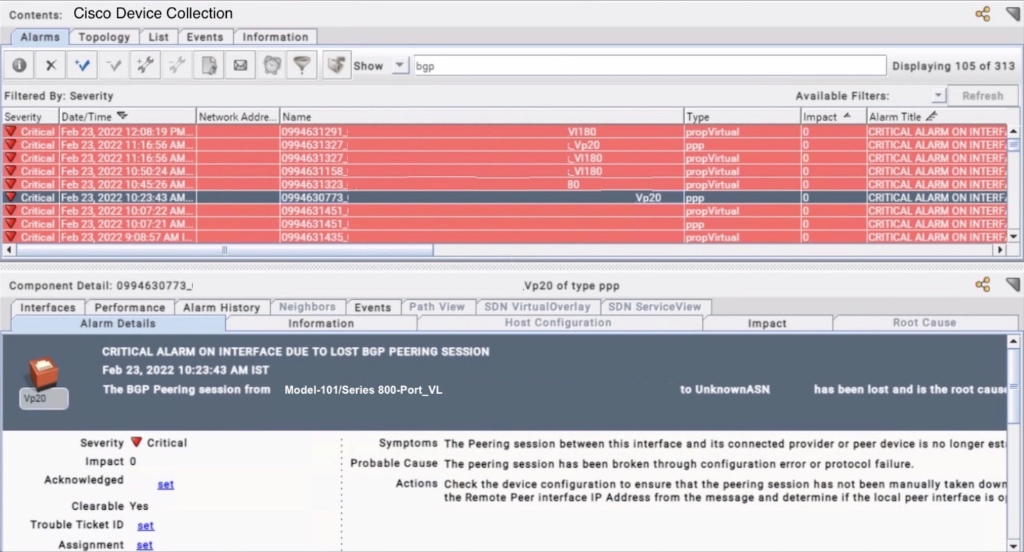 The BGP_APP4 application model will not change the issue which is that the alarms can be seen on the device model in OneClick but in Jasper reports the alarms are registered to virtual interfaces instead of the device.