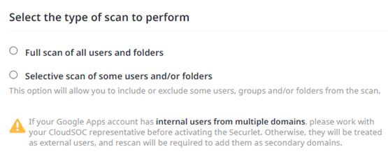 • If you intend to only monitor a subset of your GSuite users, use the 'Selective scan' option at the start of the Securlet activation form.