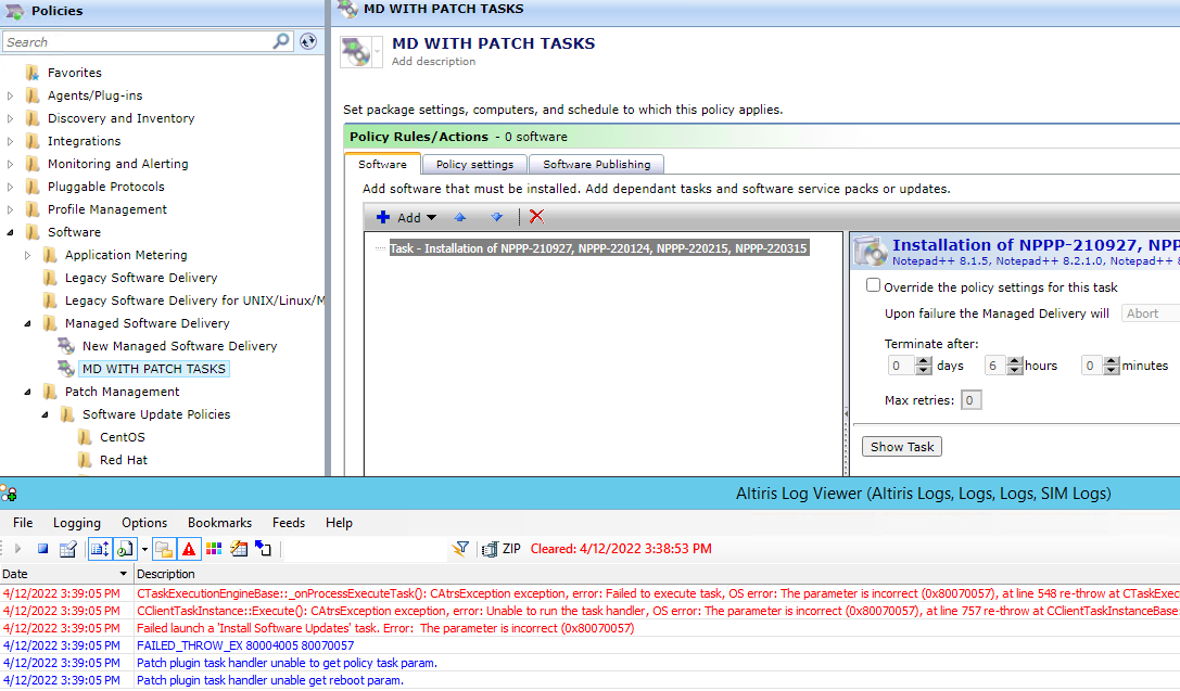 A patch installation task that is configured inside a Managed Software Delivery policy will fail when executed on the client:
