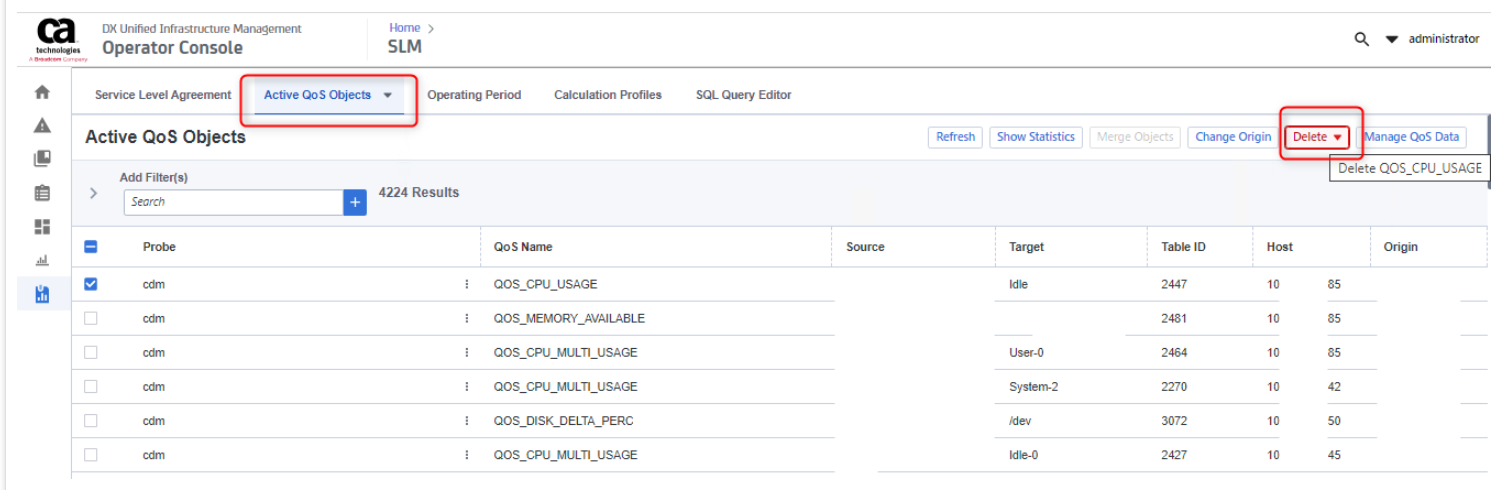 To delete QoS go to OC > SLM > Active QOS Objects > Select Targes/QOS/Oject and delete
