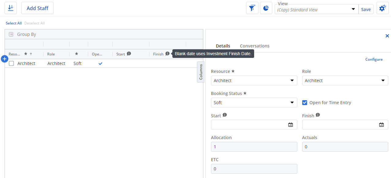 When the Staffing Start and Finish dates are blank, it indicates the duration of the Staff Allocation is using the Investment Start and Finish Dates.
