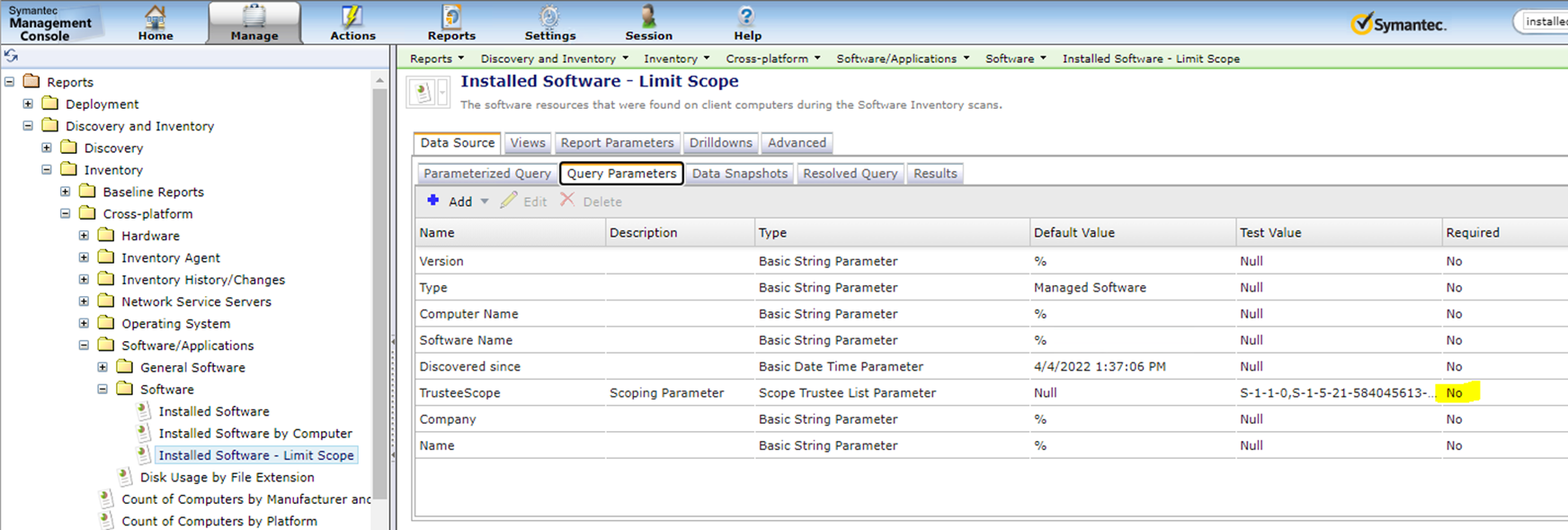 Clone the "Install Software" report and rename it to something like "Installed Software - Limit Scope", edit the cloned copy, go to the Query Parameters option, and change the TrusteeScope Required column from "Yes" to "No" as shown here: