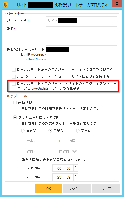 複製パートナーのプロパティで [ローカルサイトとこのパートナーサイトの間でクライアントパッケージと LiveUpdate コンテンツを複製する] を無効にして複製を行ってください。