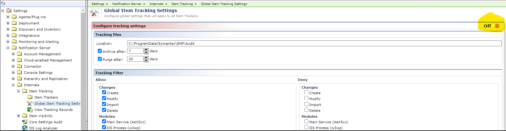 1. Check the "Item Tracking" settings on the SMP Console (under Settings>Notification Server>Internals>Item Tracking>Item Trackers) for the affected SMP Server. See if there are any "Item Trackers" enabled. By default, we don't provide or enable item trackers. This feature was introduced with ITMS 8.5 release and customers can add them if the choose to. The idea was to capture moments, when an item being changed by some rules and save info about it somewhere. See "Auditing through Item Trackers Symantec Management Platform 8.5" (KB 173483)