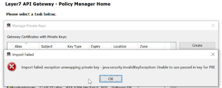 I attempted to import via the Policy Manager a new private key in our Sandbox API Gateway. However, I'm getting a failure error.