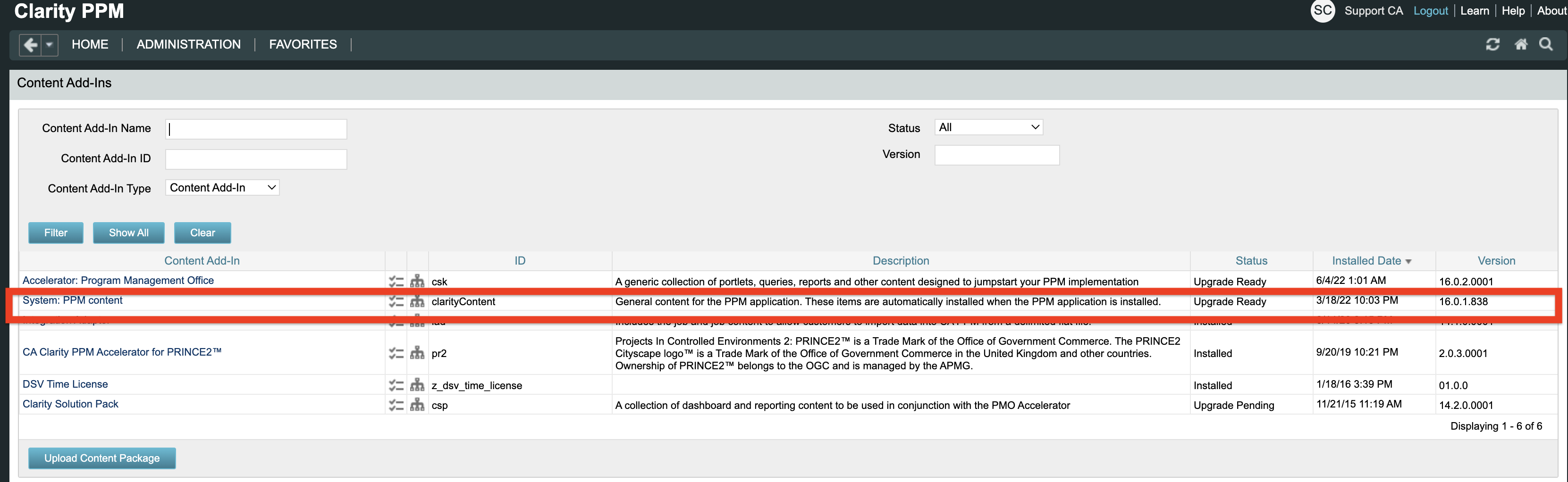 The clarity content add-in is part of the base image and does not get re-applied every release unless it changes. The installed version will reflect the last time the add-in content was installed during upgrade. PPM Content add-in does not change release-to-release and will only be upgraded if there were changes made between minor release versions.