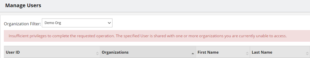 Insufficient privileges to complete the requested operation. The specified User is shared with one or more organizations you are currently unable to access.