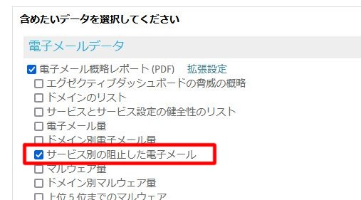 生成するレポートの種類として [電子メール概略レポート(PDF)」の [サービス別の阻止した電子メール] を選択します。
