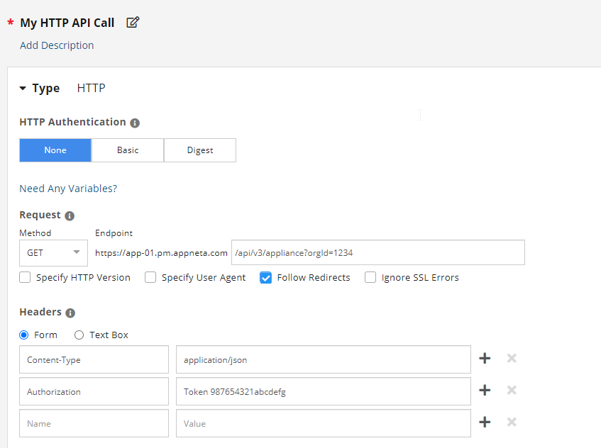 For the AppNeta Token being used in this example, I've specified the name Authorization and the value of Token <token id>.