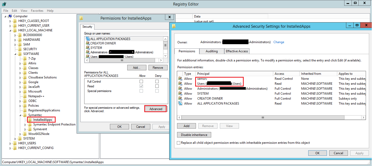 In addition, you will want to navigate to the location specified in 'HKEY_LOCAL_MACHINE\SOFTWARE\Symantec\InstalledApps\SAVCE' and verify the same permissions as above. By default this location is at C:\Program Files\Symantec\Symantec Endpoint Protection\<version>\Bin64\.