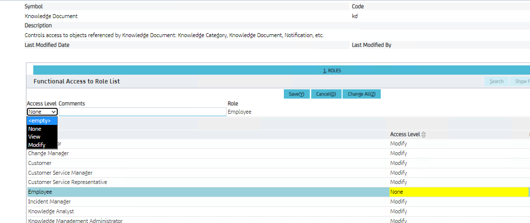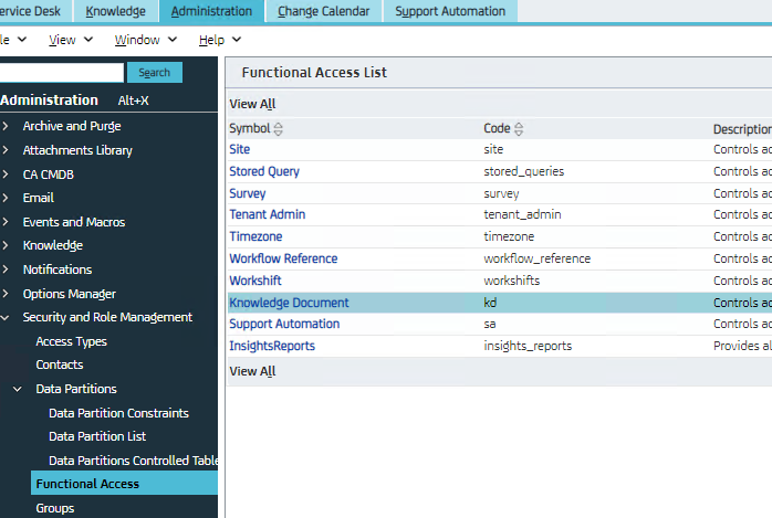 Service Desk Manager >Administration tab > Security and Role management > Functional Access > Knowledge Document >