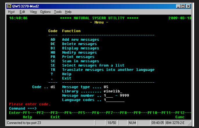Code .. diMessage type .... US << for User defined Short messagesLibrary ......... EINELIB Message number .. xxxx << the number of error message you want to display Language codes .. 1