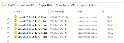 All daily archived logs will be stored in the "C:\ProgramData\Symantec\SMP\Logs\Archive" folder, and for example if there are 200 log files with each being 2mb in size, then their zipped summary size will be ~44mb.