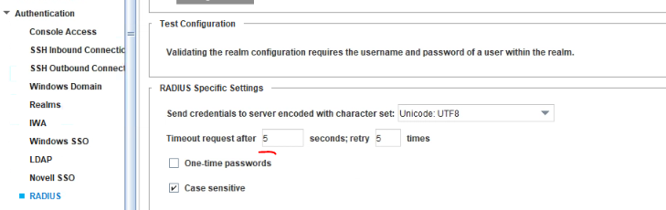 "The Timeout Request field, enter the total number of seconds the appliance will attempt to connect to RADIUS servers; the contact to the other server occurs when half of the timeout period has lapsed."