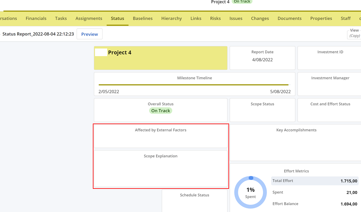 Expected Results: The data for the fields 'Affected by External Factors' and 'Scope Explanation' should be visible on the report in draft status