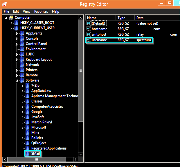 Edit the Windows registry by running Regedit.exe and navigate to the HKEY_CURRENT_USER/Software/SMail folder. Then edit the username REG_SZ.
