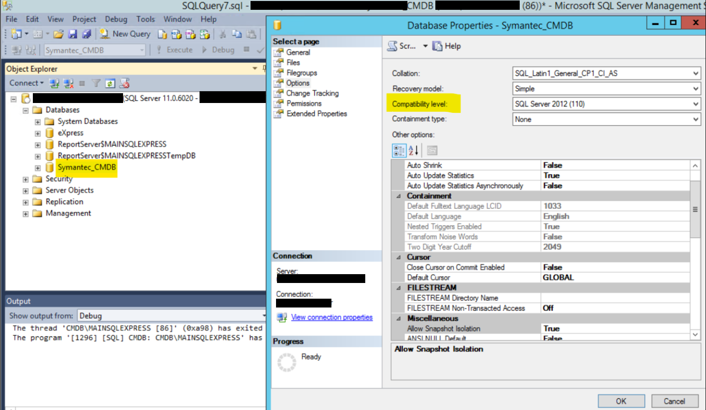 SQL>right click on Symantec_CMDB and choose Properties>Options> Compatibility Level