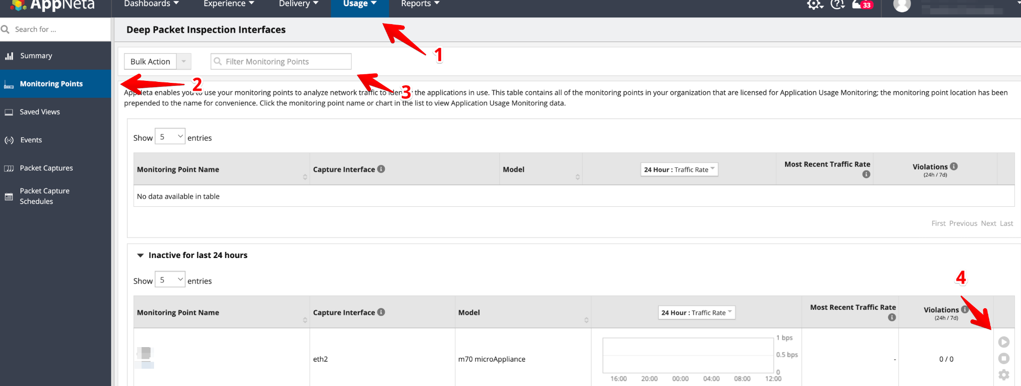 To enable click 1. Usage > 2. Monitoring Points > 3. Filter Monitoring Point and click 4. Play button to start flow analysis.