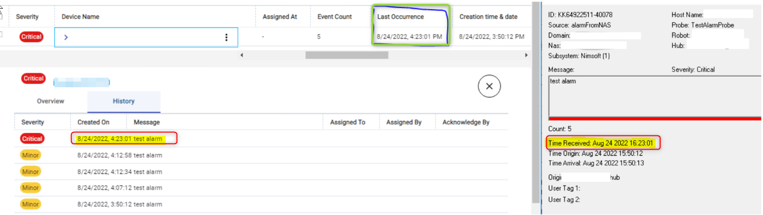 To understand why, in some scenarios, the displayed Last Occurrence time does not correspond to the very last alarm received it is crucial to differentiate between: