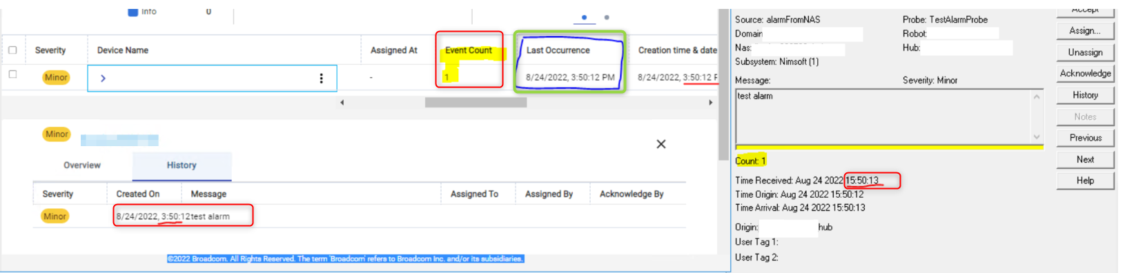 In OC the Alarm Viewer shows 1 Event count, and “Last Occurrence” Corresponds to time_arrival (TIME in NAS_TRANSACTION_SUMMARY)
