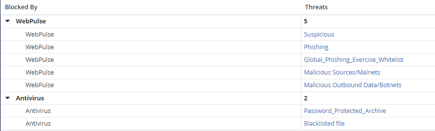 When the Security report "Trend of Threats" is executed, you may notice that some activities are blocked by WebPulse, while the others are blocked by Antivirus:
