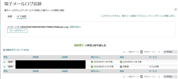 次にこのメッセージ ID を用いてメールを検索します。最初にスパム検知されたログとリリース時のログが見つかります。