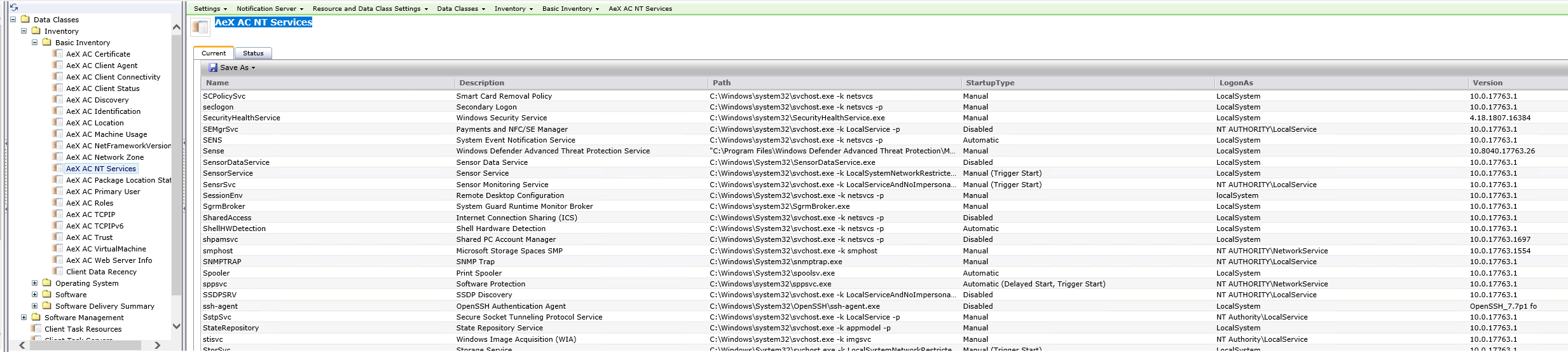 select vc.Name as [Computer Name], ser.Name as [Service Name]from Inv_AeX_AC_NT_Services serjoin vComputer vc on vc.Guid = ser._ResourceGuidwhere ser.Name = 'sens'