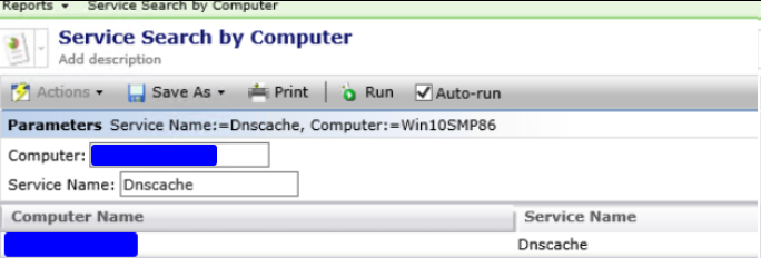 You can also import the attached report. You can specify a computer name and a service, or leave computer as % to find all computers with the specified service.