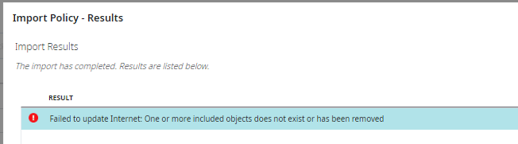 This may happen as well during export/import of VPM Policy with shared objects. The error message may slightly different but the solution would be the same.