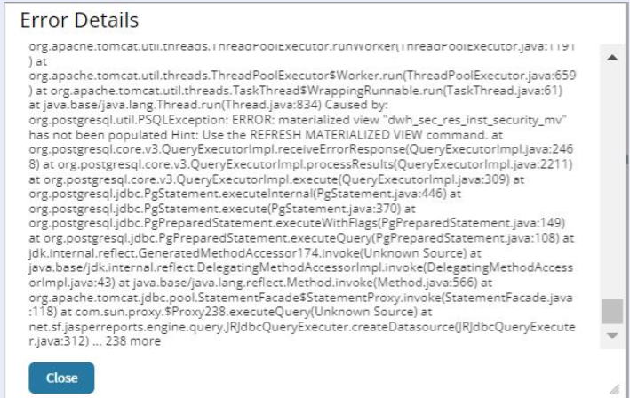 Creating adhoc views (based on custom and OOTB domains) getting 5500 ERROR: materialized view "dwh_sec_inv_inst_security_mv" has not been populated.