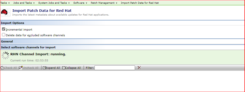 The MetaData Import for Linux doesn't show the tree of available errata channels and it loads in a loop, and the RHN Channel Import is stuck in a running loop and the Stop button doesn't work: