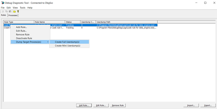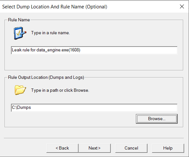 Then click on Next, choose the Dumps path where it can be stored, by default it will be stored in C:\Program Files\DiagDiag\Logs\Leak rule for data_engine.exe, but it can be changed to your own location,