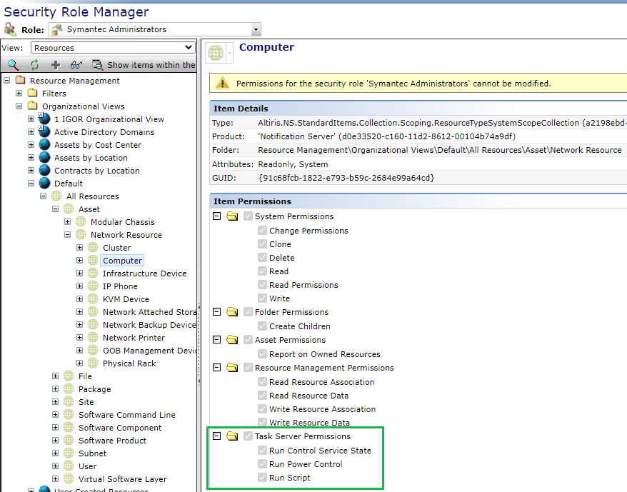 The "Run Control Service State" and "Run Script" permissions in Security Role Manager were not enabled for the Computer resource type.
