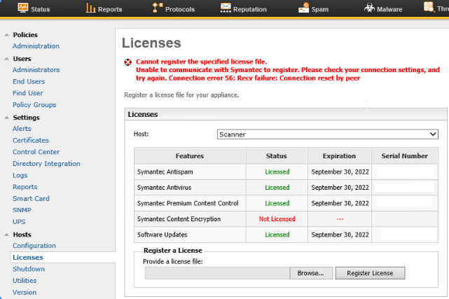 Unable to register Messaging Gateway license. Attempting to register license returns the error