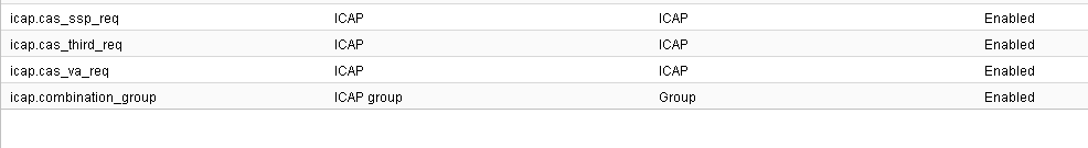 The ProxySG has an ability to configure load balance in multiple ICAP services. Here is an example, there are three ICAP services and a ICAP group. The ICAP group as "ICAP.combination_group" is configured in two ICAP services.